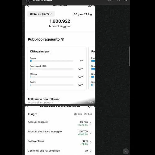 Ho conosciuto Martina che aveva molto timore del giudizio altrui e aveva meno di 7 reels pubblicati. Ad oggi lei lavora full-time a questo, raggiungendo milioni di visual ogni mese.