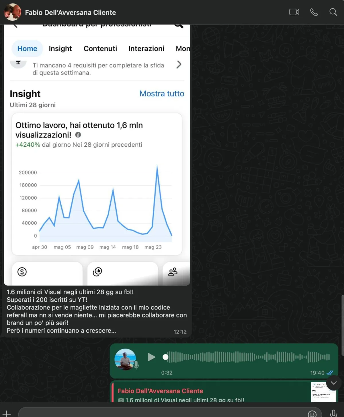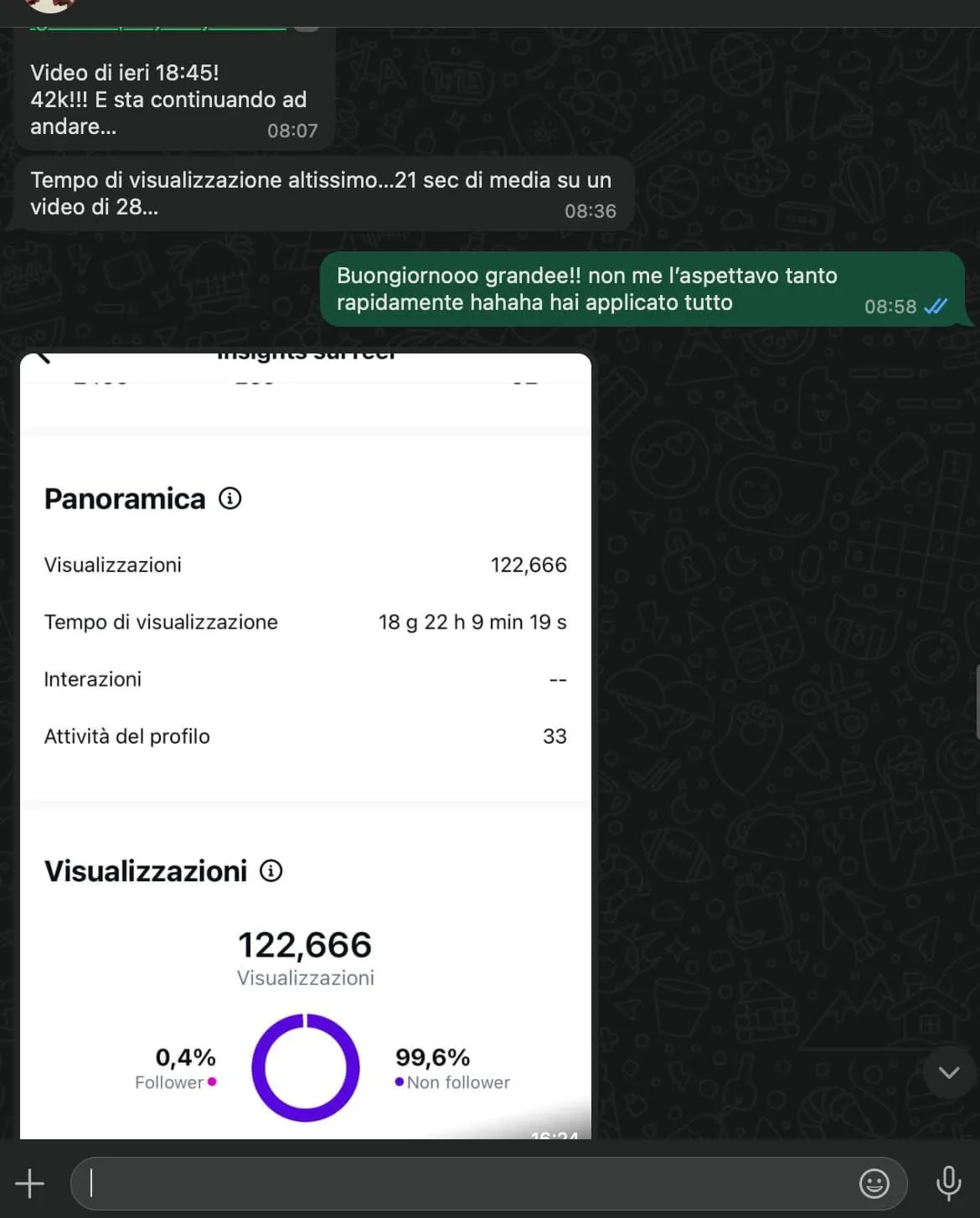 Fabio è un quarantenne a cui ne daresti si e no 30 se non meno. ha applicato ogni insegnamento e nelle prime 2 settimane ha superato le 500.000+ visualizzazioni solo su Instagram, 100.000+ su Tiktok e 230.000 su Youtube in 20 giorni ed è in rapida crescita. è un treno.